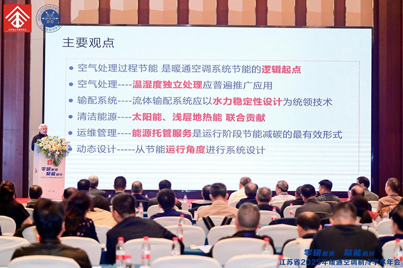 下半场主题报告环节中,浙江省建筑设计研究院有限公司暖通总工金华飞围绕“空调系统数字化节能运行的研究与实践”展开论述;格瑞海思人居环境科技(江苏)有限公司总经理何强勇介绍了“精准控湿·节能零碳——格瑞工业恒温恒湿系统在高端制造中的创新实践”;江苏野牛暖通设备有限公司董事长郑志连以“驭风而行,智造未来”为题作了报告;江苏筑森建筑设计有限公司暖通总工雷栋分享了“基于数据分析下的商业综合体负荷计算思考”;方快锅炉有限公司研发总监卢洁阐述了“烟气源热泵在供暖与工业的节能应用”;北京京创鑫业科技有限公司总经理赵东方展示了“高大空间专用空调应用场景”;瑞福莱暖通设备(上海)有限公司总经理杨颖探讨了“空调水系统定压排气关键技术及解决方案”;中通服咨询设计研究院数据中心行业中心副主任戴新强就“AI大发展背景下,江苏省算力中心建设布局与未来发展探讨”作了发言;杭州卓邦环境设备有限公司技术总工朱建军介绍了“好房子卓邦解决方案之新风恒湿与地库除湿”;丹佛斯(中国)投资有限公司应用技术专家付世元分享了“智能精确控制-暖通空调系统高效解决方案”;南京天加环境科技有限公司商用事业部总经理赵凌骁带来“SEE MY GROWTH-细分行业解决方案分享”;江苏省建筑设计研究院股份有限公司暖通总工夏卓平则围绕“江苏省公共建筑节能目标研究及暖通空调设计”作了报告。